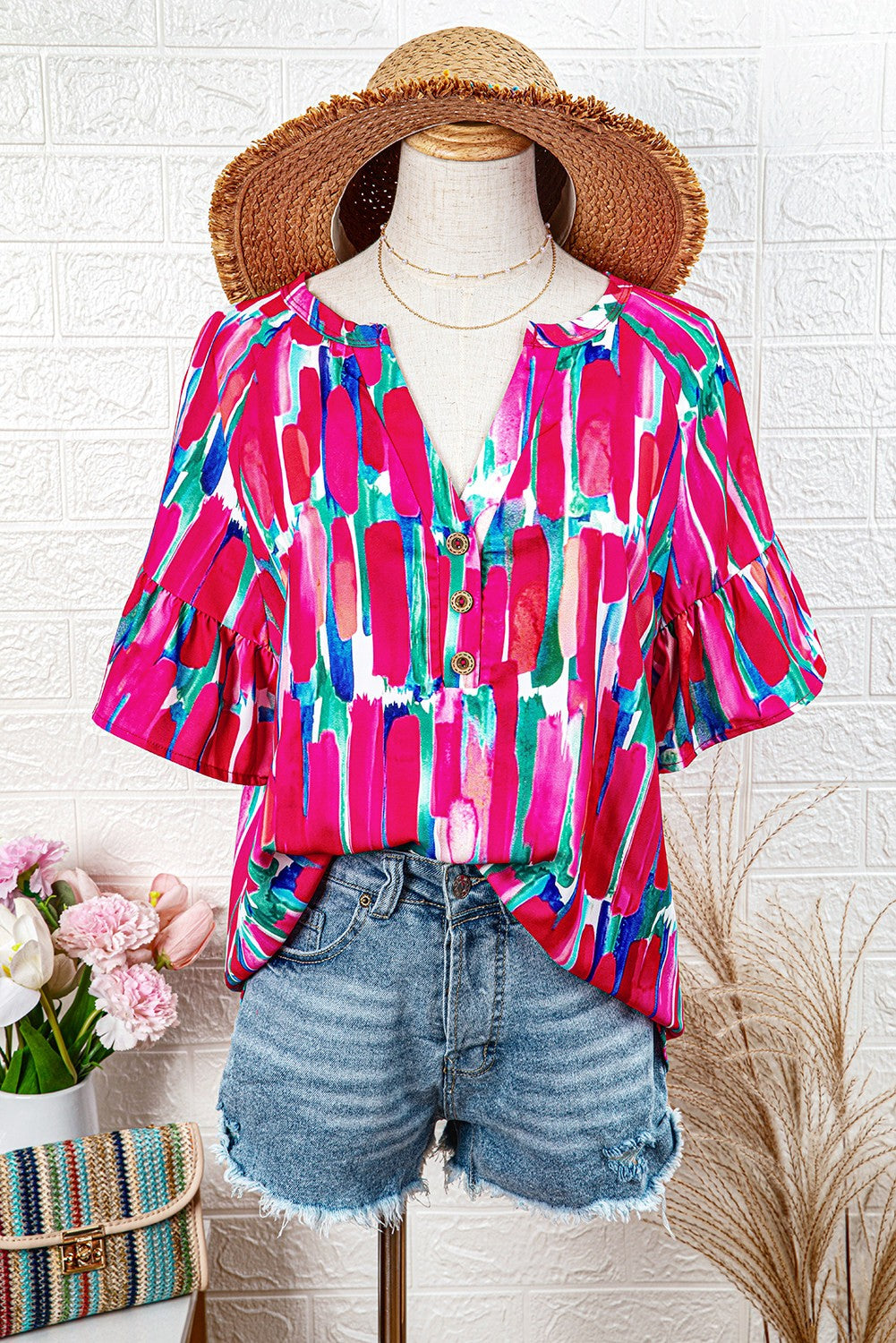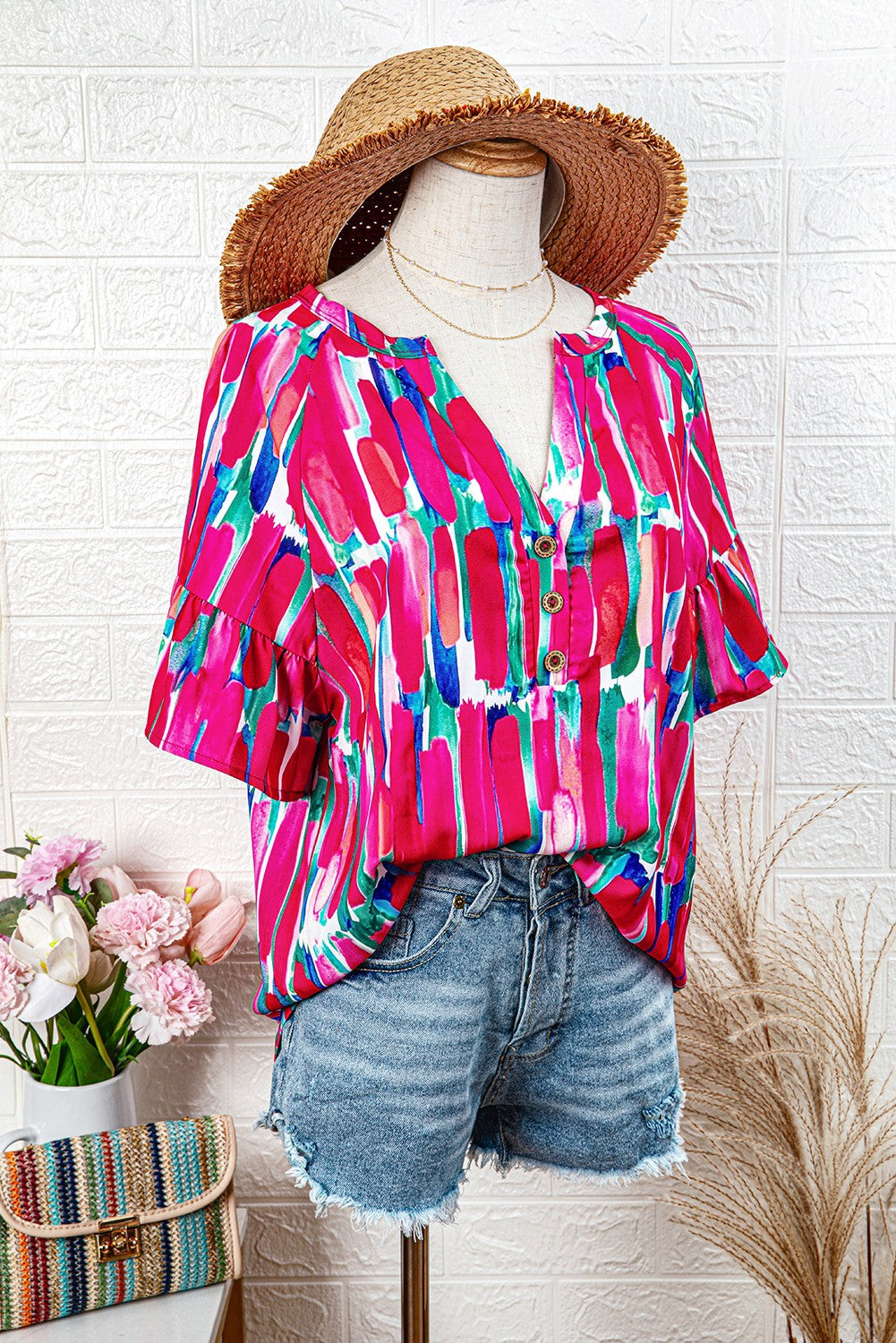 Abstract Brushwork Print Buttoned V-neck Blouse
