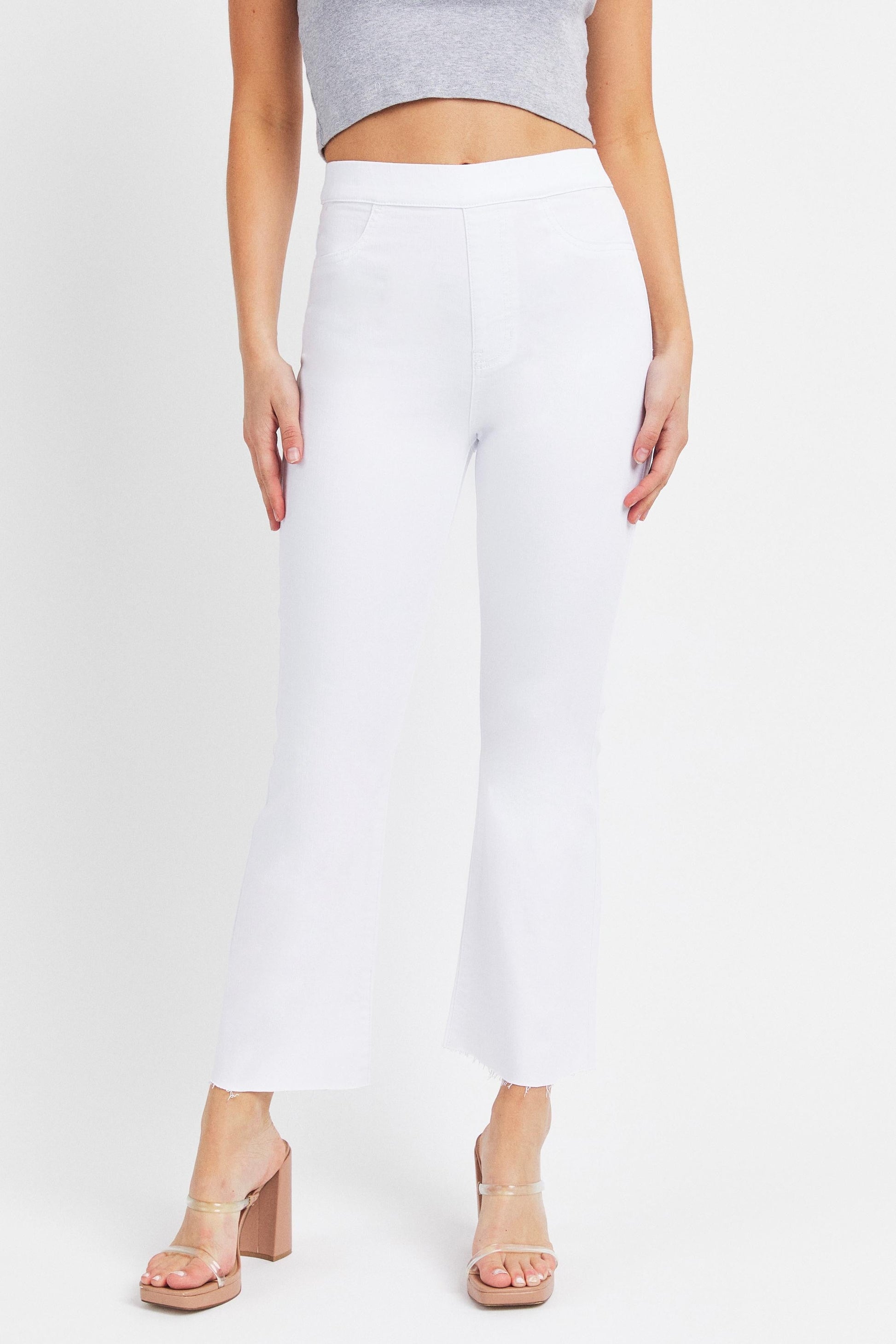 Easy & versatile pull-on high-rise jeans in white denim featuring a flared cropped hem. 26" Rise: 11 1/2"