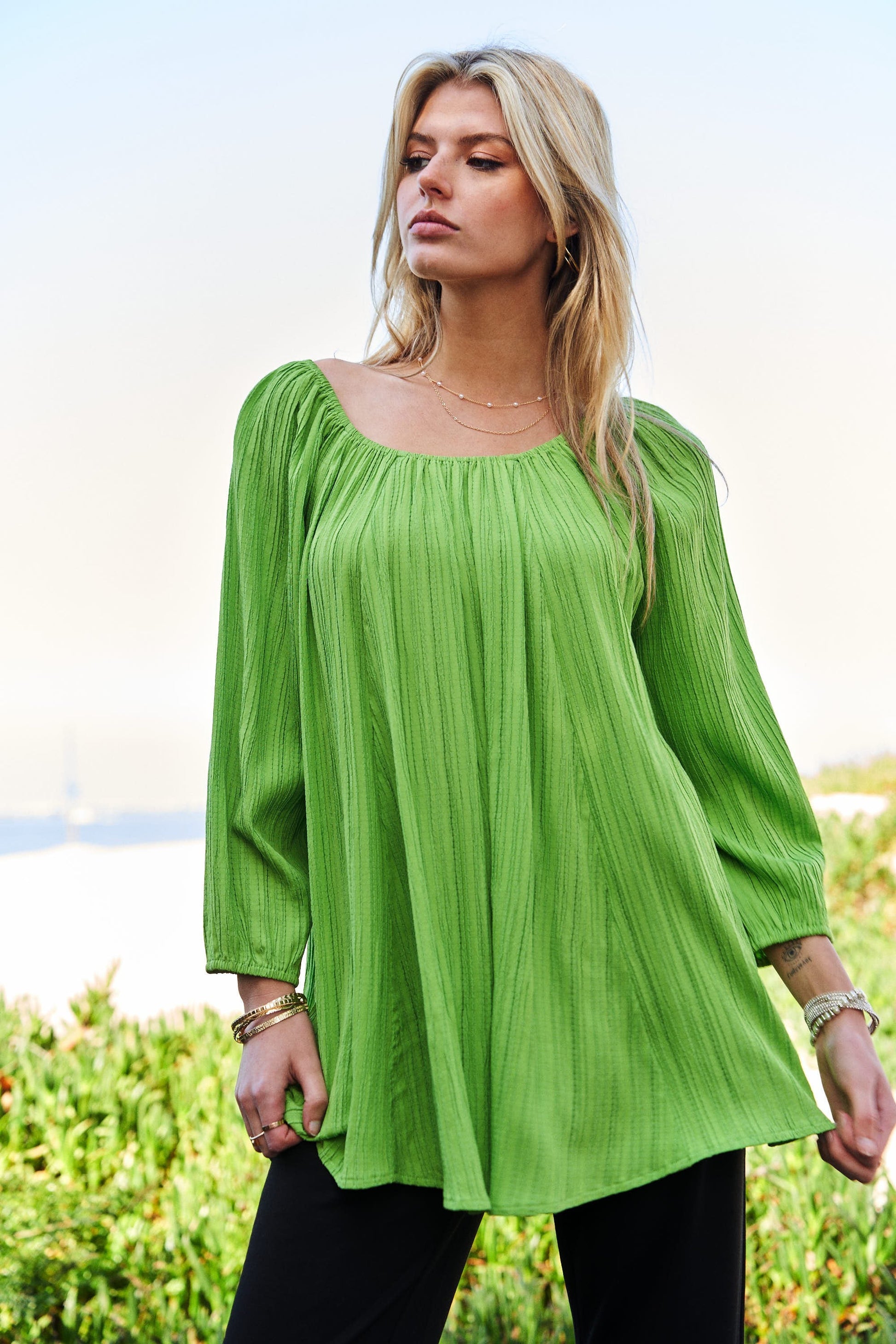 CRINCKLED TEXTURE FABRIC WIDE NECK SWING TOP