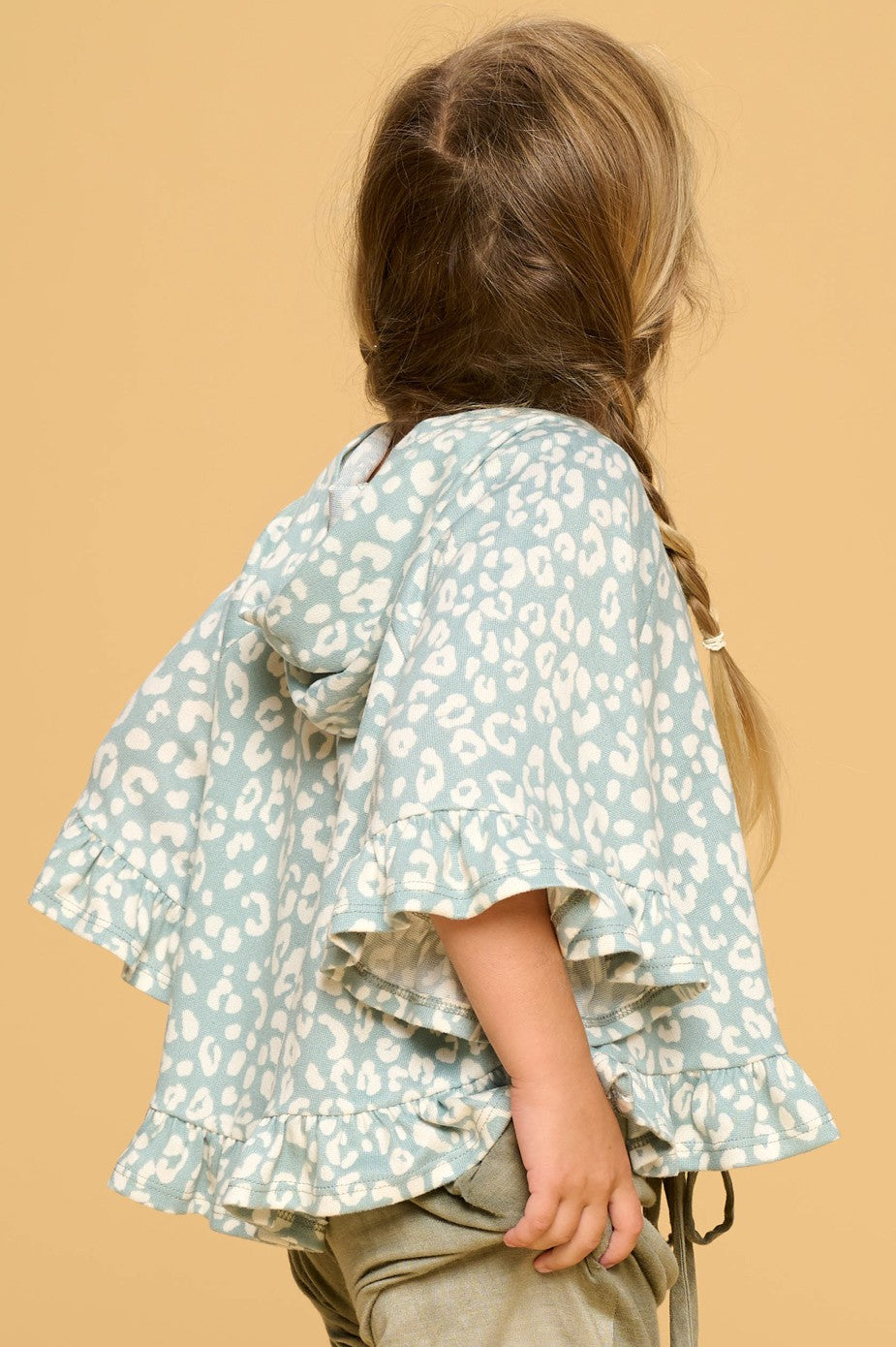 Animal printed ruffle tunic top featuring 3/4 length sleeves, a round neckline and hoodie.