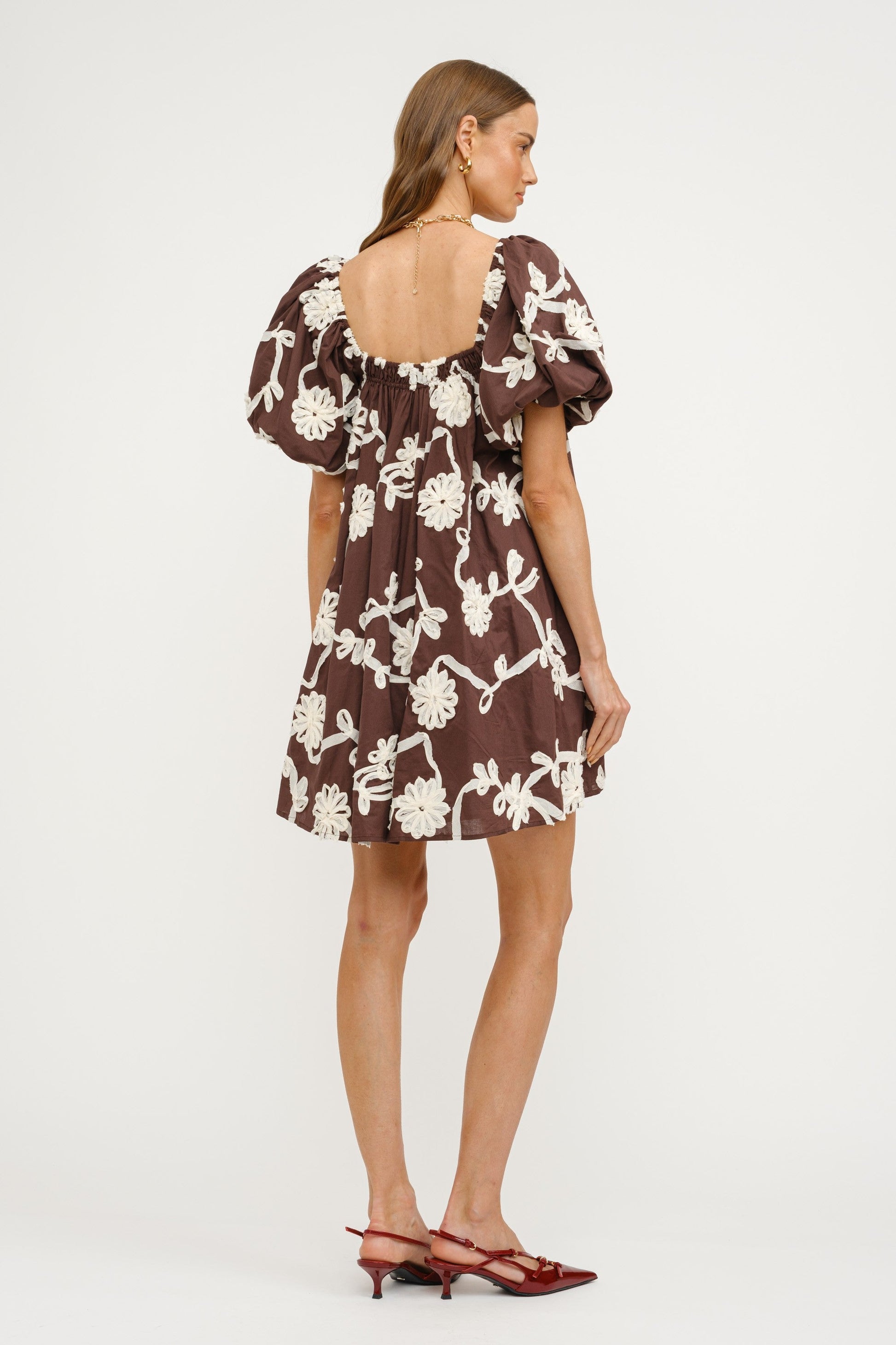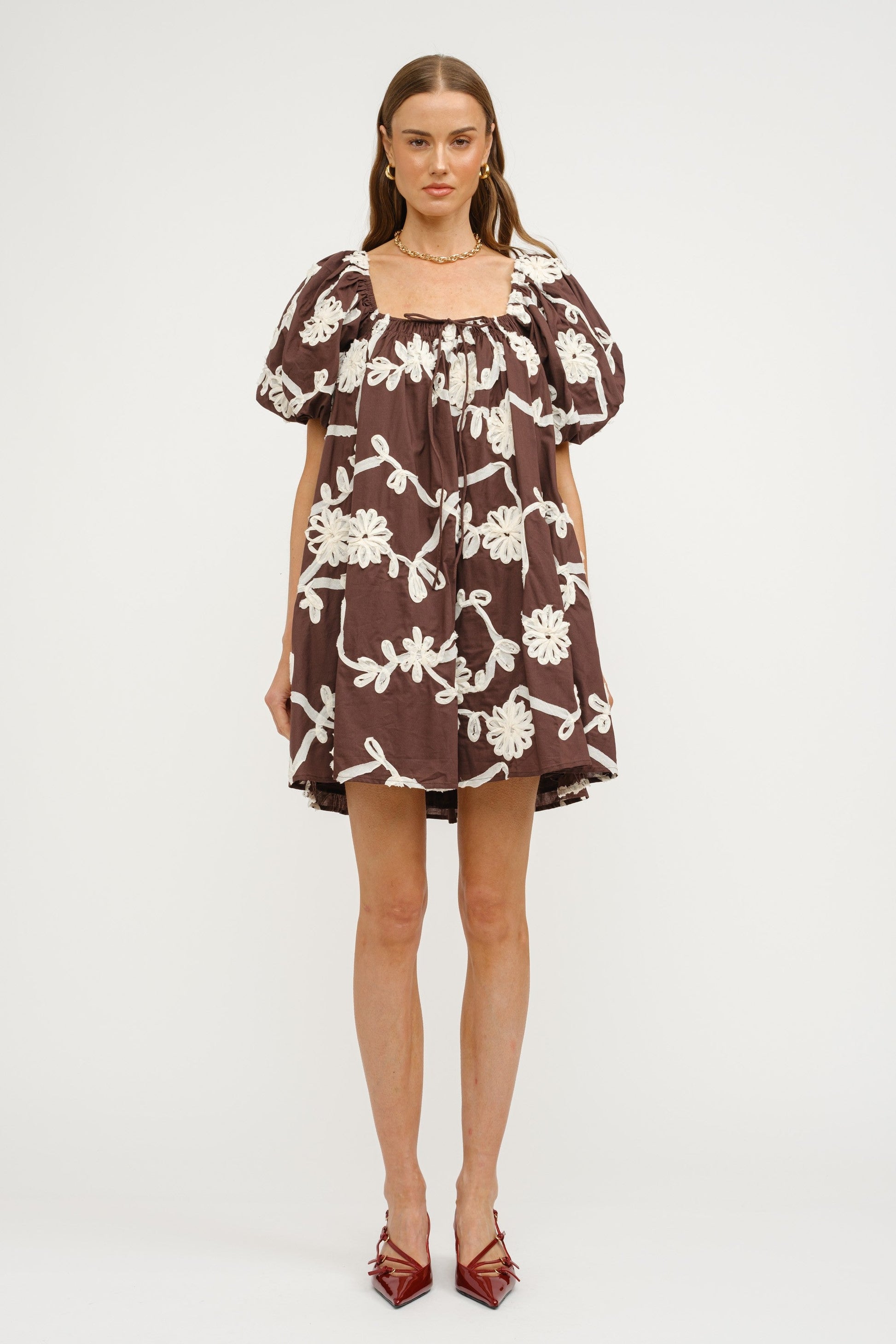 BROWN FLORAL EMBROIDERY MINI DRESS