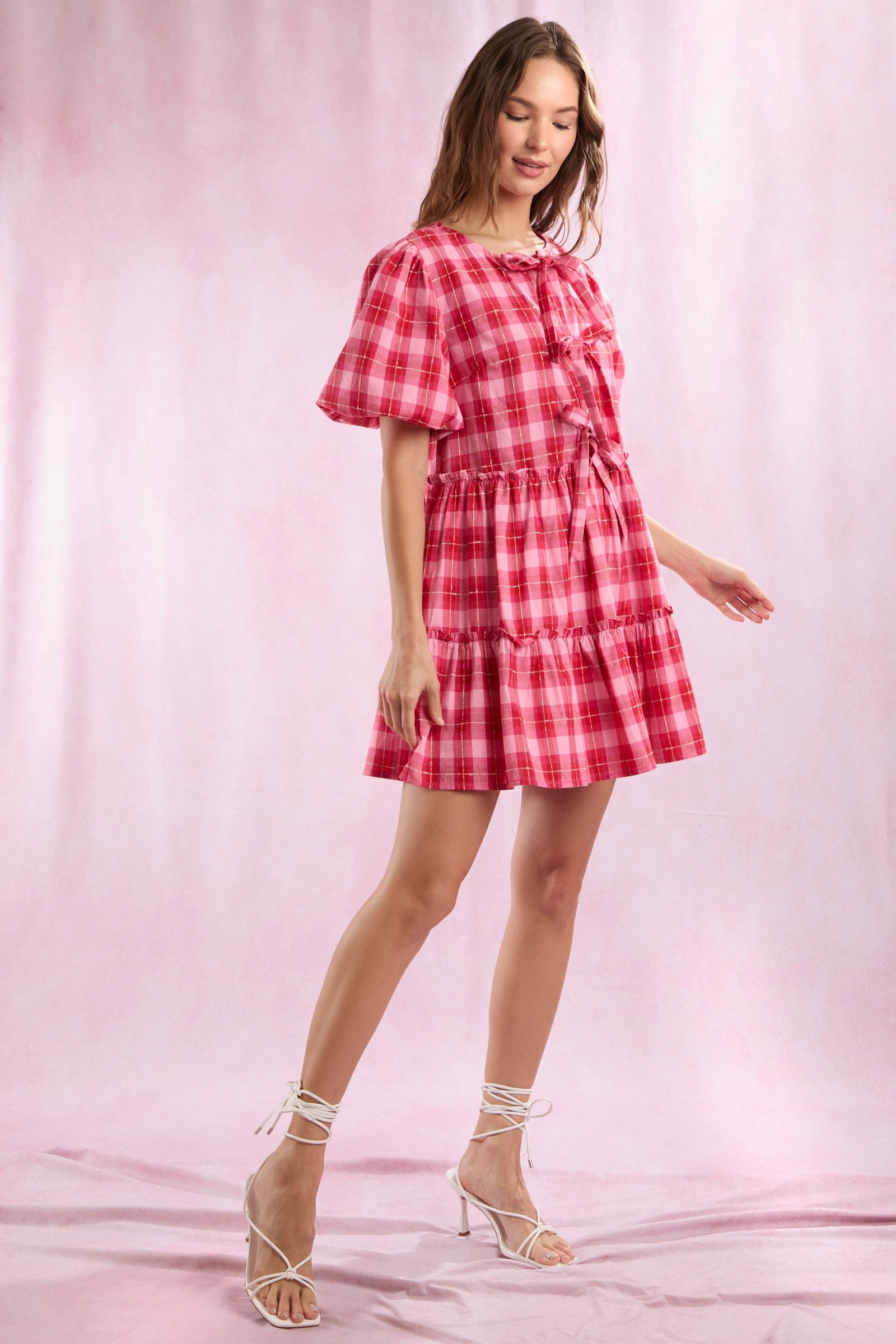 Valentine Plaid Tied Bow Detail on Front Bow Detail Bubble Sleeve Mini Dress