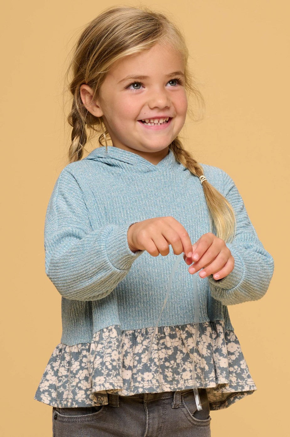 Print block hooded rib knit top featuring long sleeves and contrast floral print.