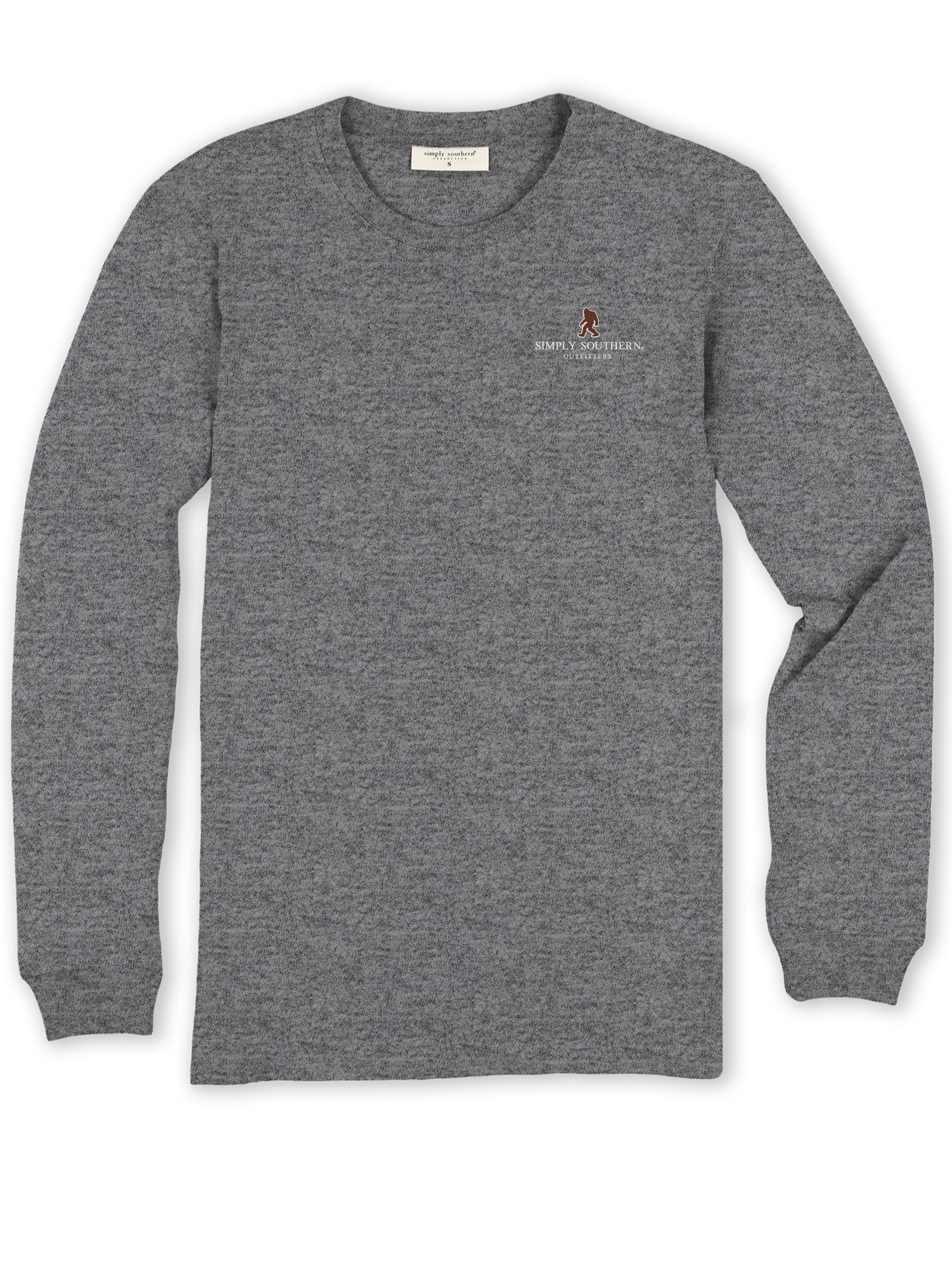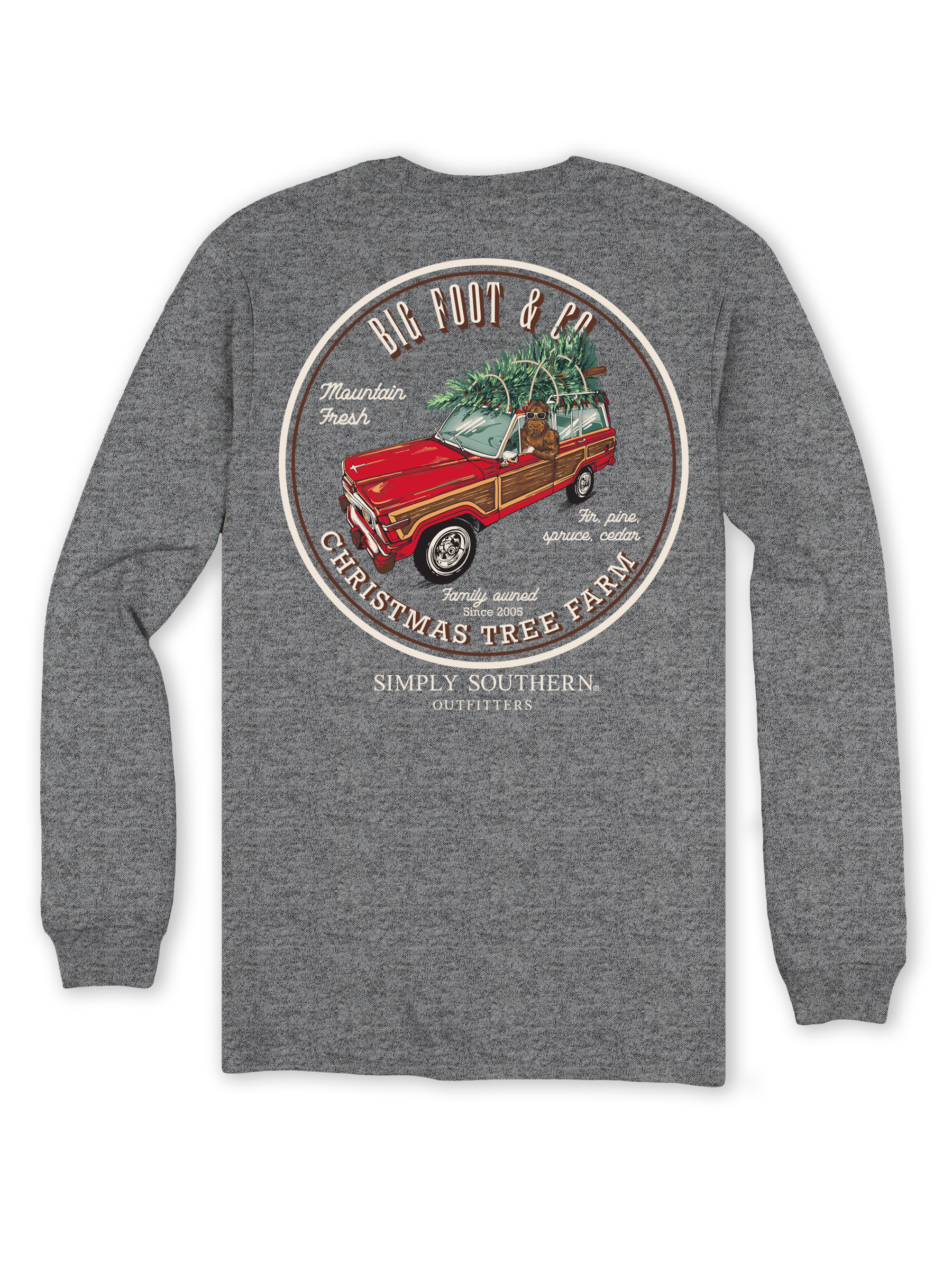 Dark heather grey long sleeve shirt showing "Big Foot & Company Christmas Tree Farm" with a sasquatch driving a car with a pine tree strapped to the top. 100% cotton
