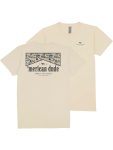 Wisp tan short sleeve shirt with the phrase ''Merican dude' There is a camouflage border above. Simply Southern logo below. Simply Southern logo with dog holding leash in mouth on left chest. 100% cotton. Unisex sizing.