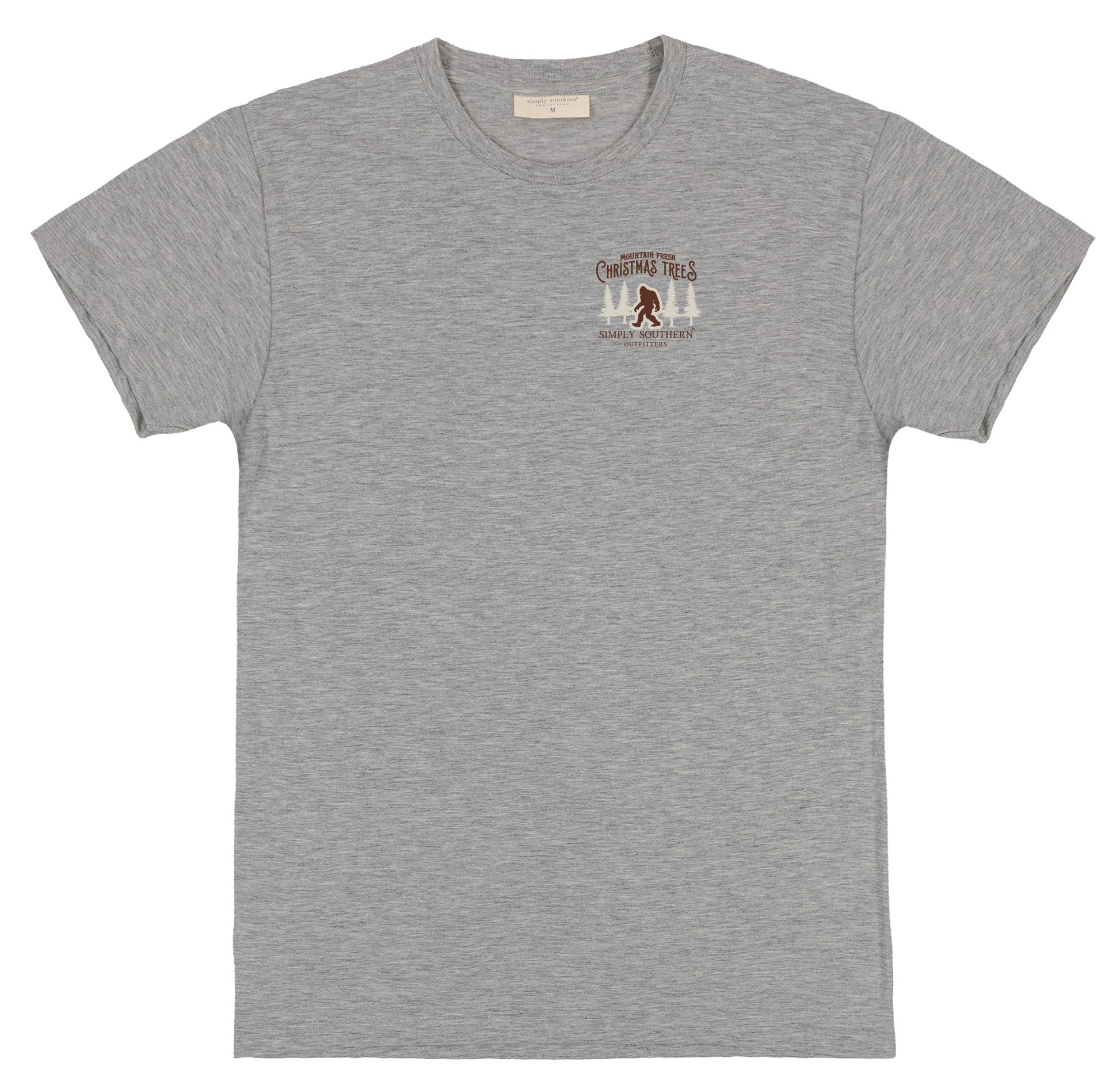 Heather grey short sleeve shirt showing "Mountain Fresh Christmas Trees" and "Cut and Carry" and a sasquatch dressed as a Santa carrying a freshly cut tree. 100% cotton